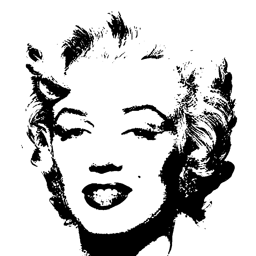 Warhol already flattened Marilyn into a repeatable icon. TBAM compresses again through dithering and grid logic, turning the icon into a constrained pattern vocabulary that can be recomposed indefinitely.